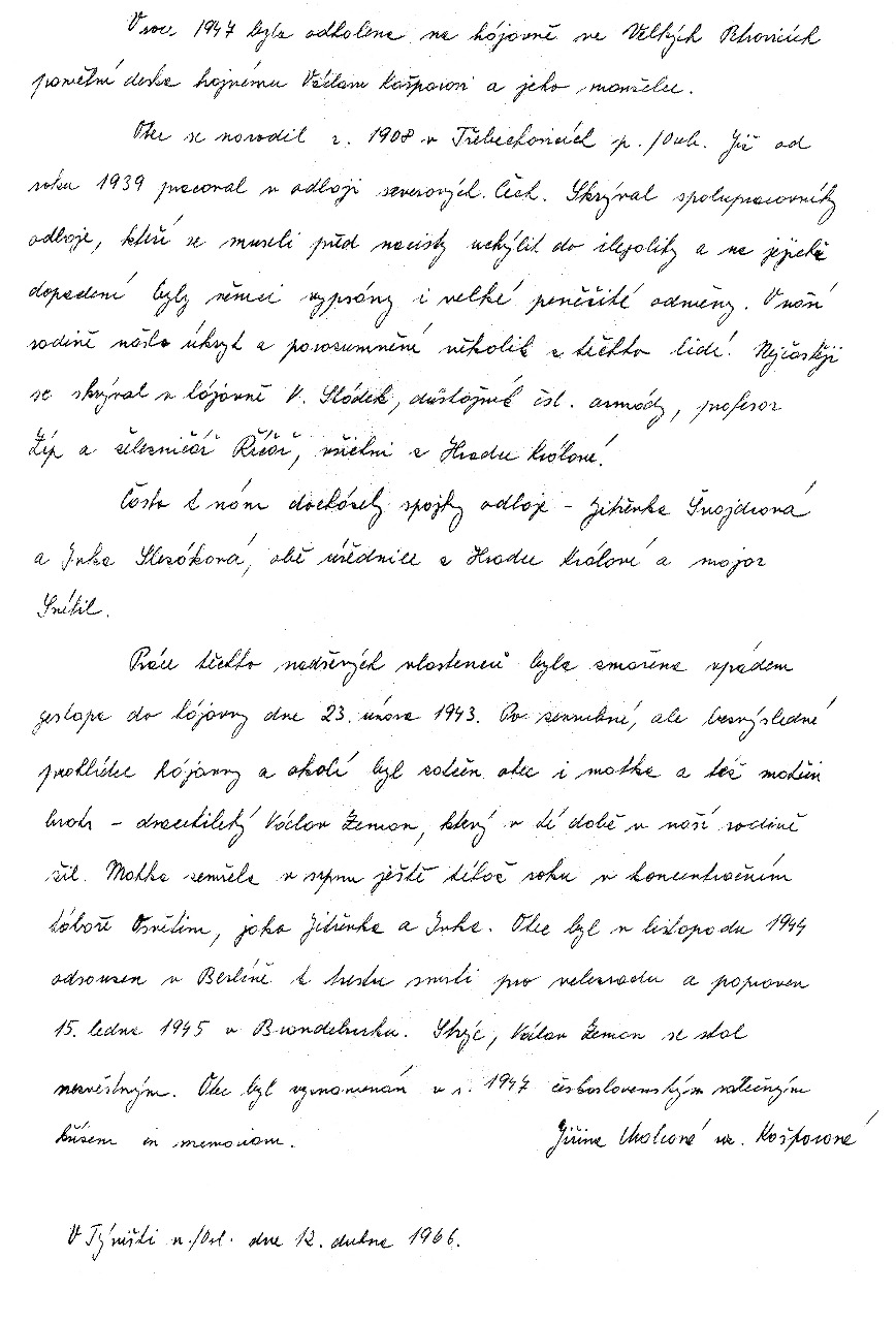 Otec se narodil r. 1908 v Třebechovicích pod Orebem. Již od roku 1939 pracoval v odboji severovýchodních Čech. Skrýval spolupracovníky odboje, kteří se museli před nacisty uchýlit do ilegality a na jejichž dopadení byly Němci vypsány i velké peněžní odměny. V naší rodině našlo úkryt a porozumění několik z těchto lidí. Nejčastěji se skrýval v hájovně A. Sládek, důstojník československé armády, profesor Zíb a železničář Říčař, všichni z Hradce Králové. Často k nám chodívaly spojky odboje - Jitřenka Šnajdrová a Inka Slezáková, obě úřednice z Hradce Králové a major Snítil. Práce těchto nadšených vlastenců byla zmařena vpádem gestapa do hájovny dne 23.února 1943. Po zevrubné, ale bezvýsledné prohlídce hájovny a okolí byl zatčen otec i matka a též matčin bratr - dvacetiletý Václav Zeman, který v té době v naší rodině žil. Matka zemřela v srpnu ještě téhož roku v koncentračním táboře Osvětim, jako Jitřenka a Inka. Otec byl v listopadu 1944 odsouzen v Berlíně k trestu smrti pro velezradu a popraven 15.1.1945 v Brandenburku. Strýc, Václav Zeman se stal nezvěstným. Otec byl vyznamenán v roce 1947 Československým válečným křížem in memoriam. |